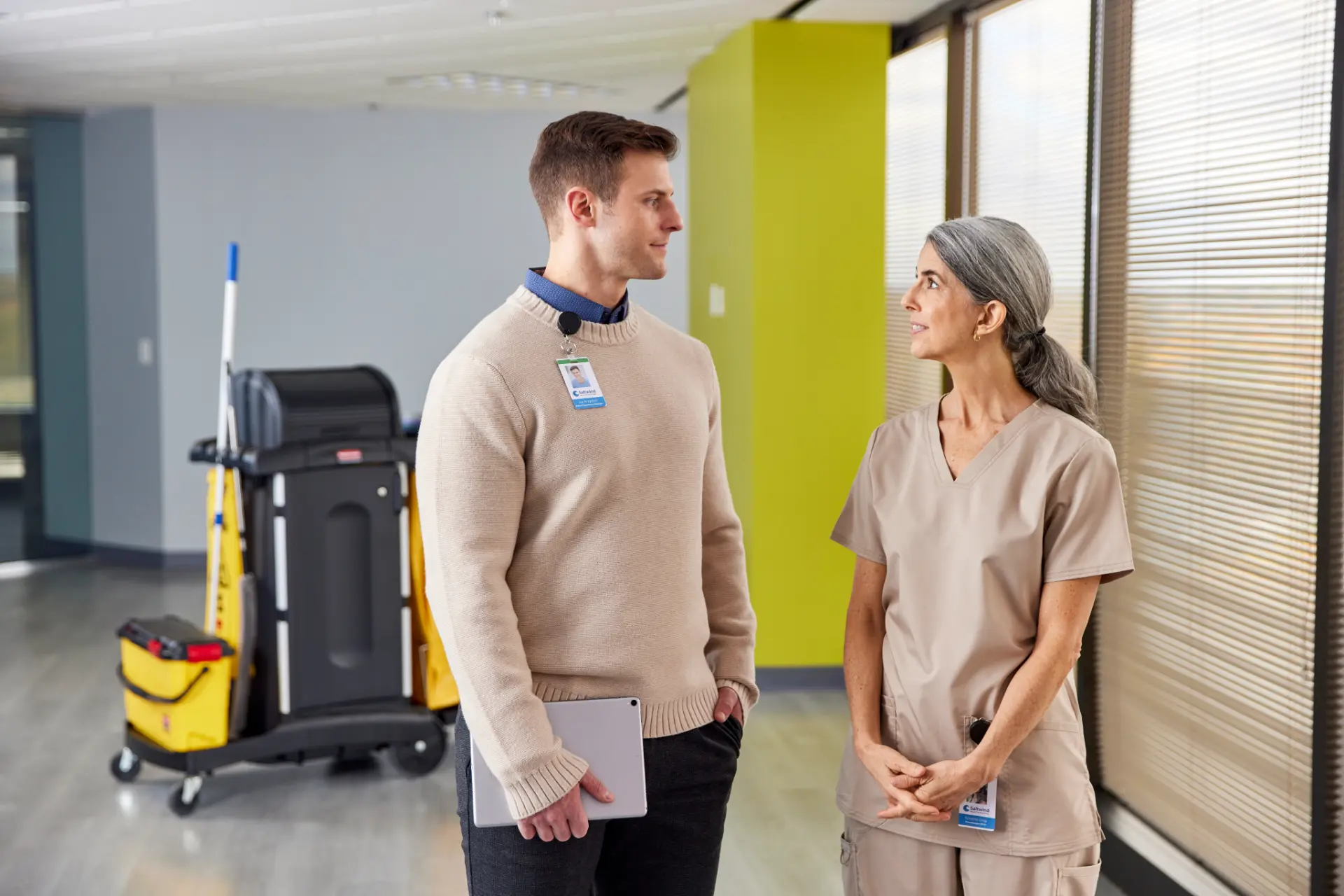Most safety risks come from the realities of the work – physical strain, exposure to chemicals or infection, slips during floor care, and behavioral challenges in patient observation roles. Embedding safety into daily routines through clear protocols, accessible PPE, maintained equipment, and visible leadership reinforces trust. When safety becomes part of how work is done, engagement and stability follow.